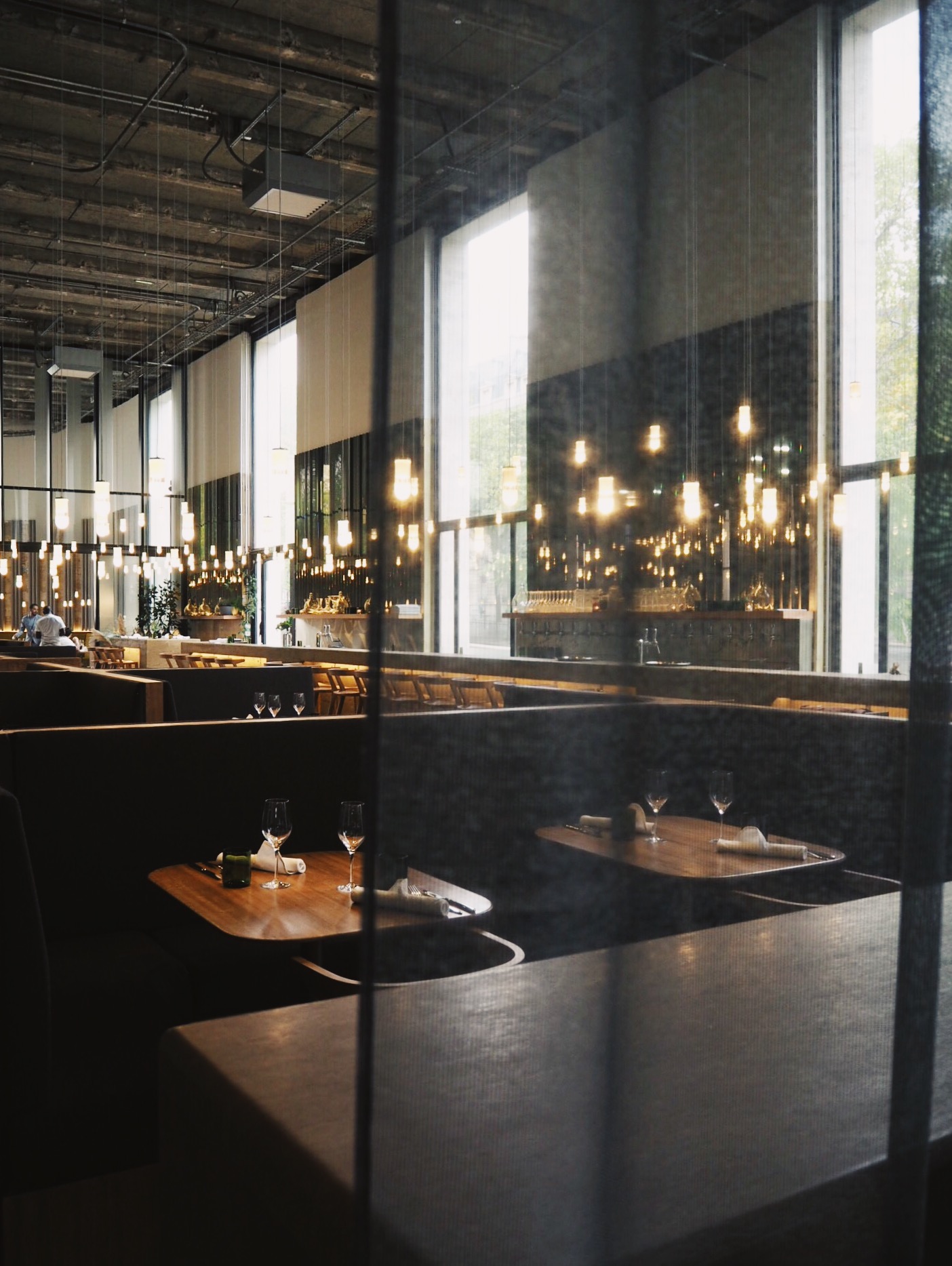 In this beautiful corner of the restaurant you’ll find a special wall covering. The walls behind the cosy benches have an abstract patina look with a fur finish and are decorated with fabric covered polystyrene tubes used as sound absorbers, it’s joints are filled with mirrors. A very beautiful, smart and special detail. The chairs in the front are from the Parisian furniture manufacture Maximum and were up-cycled from industrial plastic waste.