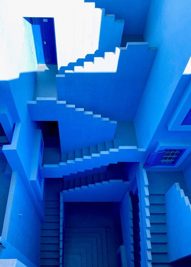 La Muralla Roja, which is sitting on cliffs making it visible especially from the water, was inspired by the Kasbah, a typical architecture form of the Arab Mediterranean, it is playing and mixing the inner with the outside, the private and the public. Internal structures are designed after a Greek cross and are intersecting at the service towers. The main idea behind encouraging the residents to come together again, a social provocation, an experiment. Here the inner and circulation surfaces are painted in different shades of blue, indigo and purple, which is supposed to create an illusion to blend with the sky, while the red and pink tones of the outer walls are building a contrast to the dry and sandy landscape.