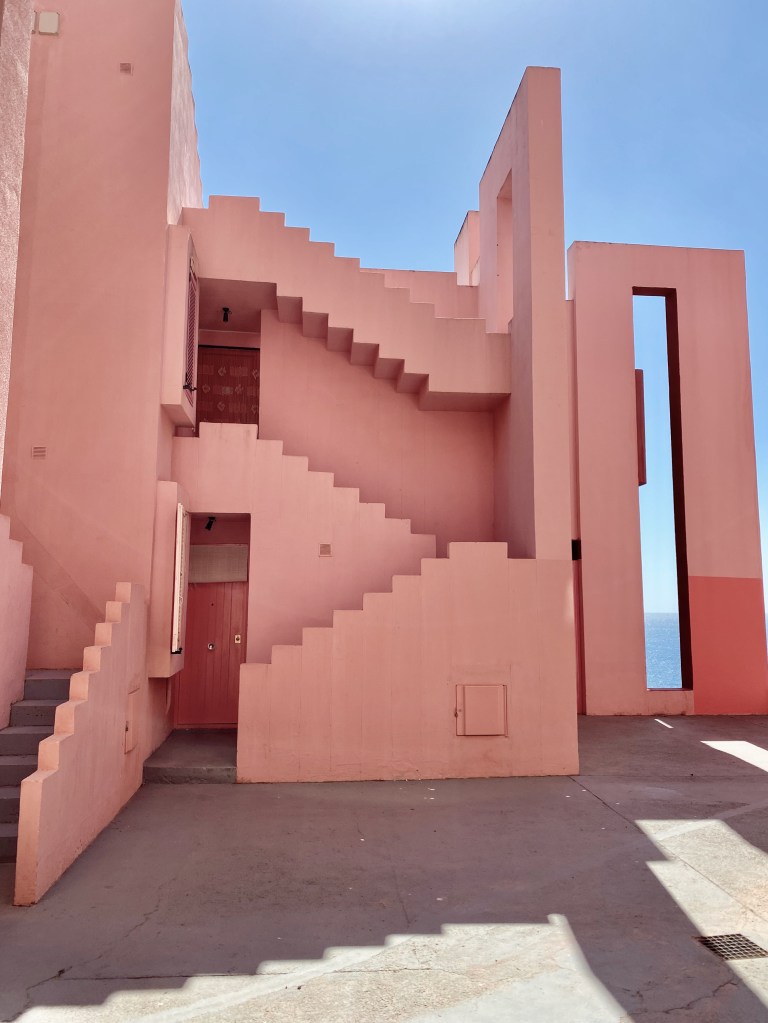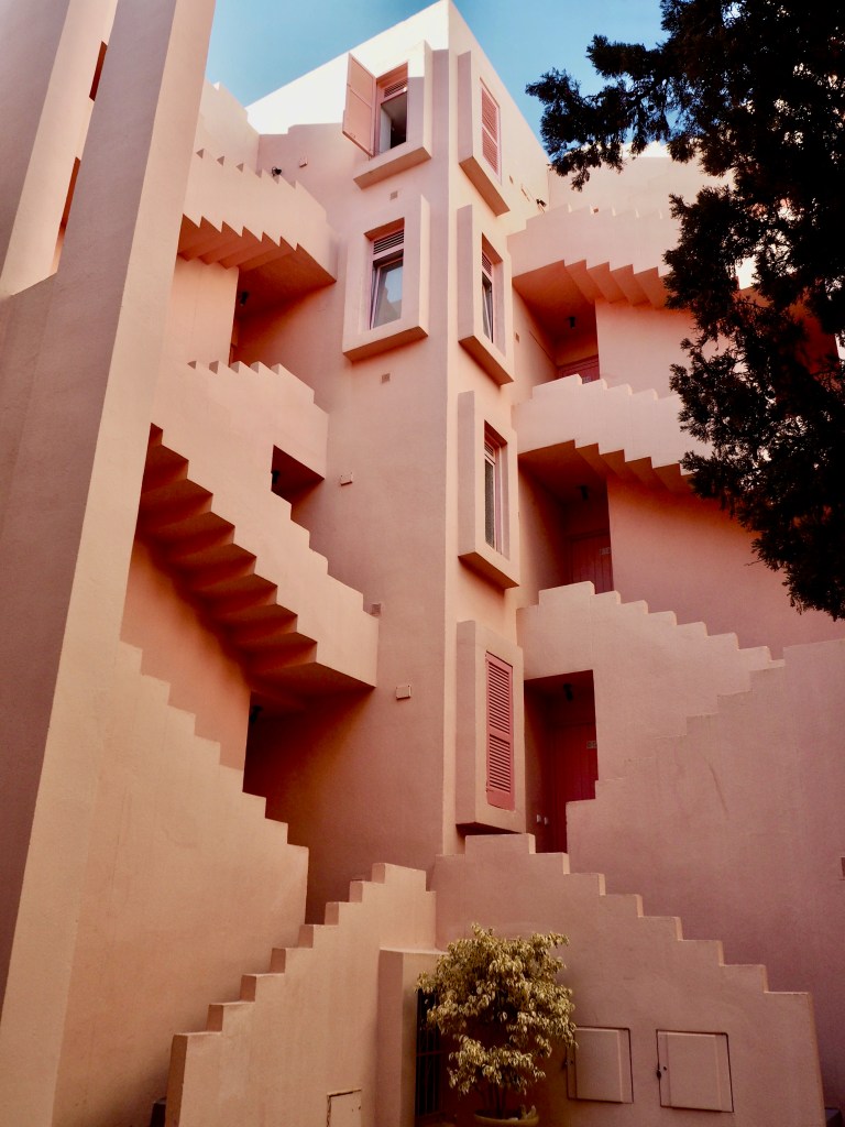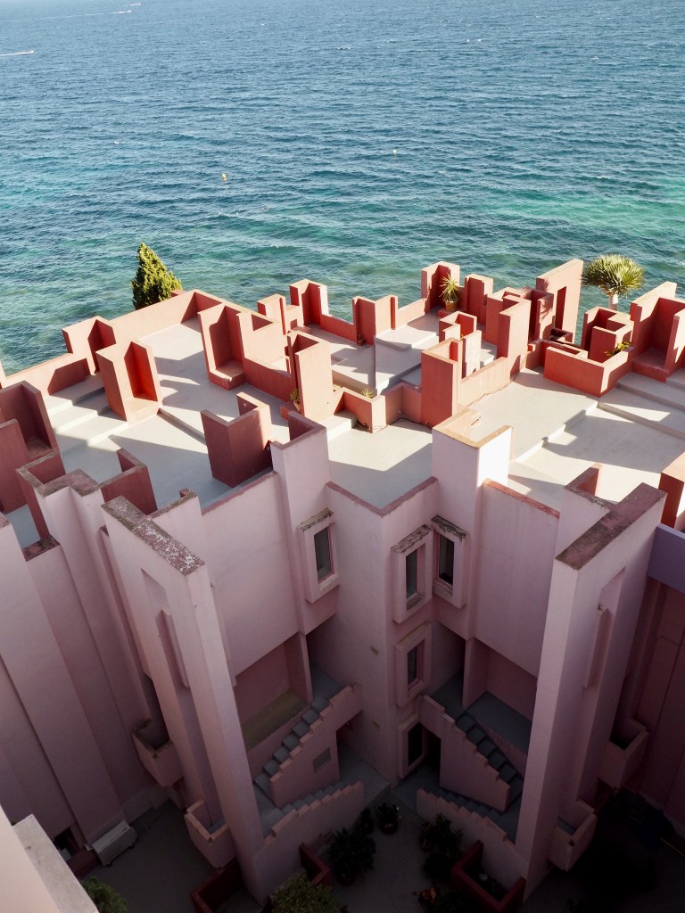 Many of you might know about this architectural gem from architecture books, magazines or simply Instagram and like myself, have been wanting to visit it. I have been truly fascinated and inspired by post-modern architecture for the last few years and this building tops the list. Coincidentally my summer plans this year led me almost directly to it. As soon as I noticed I’d be staying very close to Ricardo Bofill‘s apartment buildings (yes plural, but more to this later) I checked out how to visit La Muralla Roja. Since it’s a private apartment building the only way to visit it is to indeed book a stay in an apartment over AirBnB. I was unbelievably lucky, as the day I was planning to stay was the only available day for the whole of summer. So an entire apartment with 2 bedrooms and 3 balconies (facing different directions) was booked and I was more than happy to realise that this visit was really going to happen. It didn’t take long to convince my architects friends to come and share the experience with me.