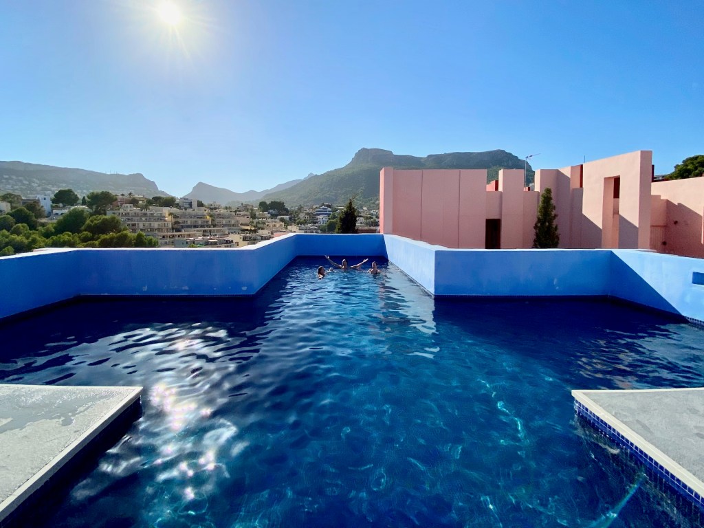 After we took the first pictures of the impressive powder pink staircases, which surrounded us, we then ran upstairs to test out the highlight of the apartment, the stunning pool. A necessary relief at around 32 degrees celsius outside. The dark blue cross shaped pool is located on the rooftop on the back of the apartment block and looks out to the mountains of Calpe.