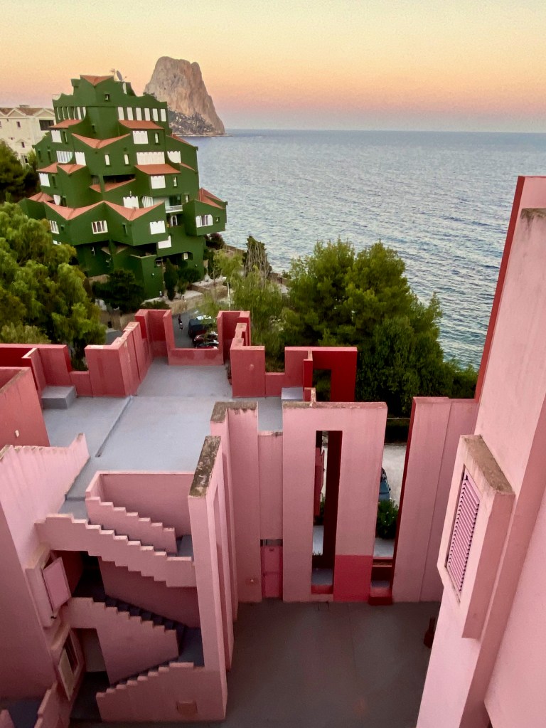 So when we arrived at La Muralla Roja, which we could already spot from a distance, we were pleasantly surprised to discover that it was almost entirely freshly painted. They were actually still painting parts of it, which was totally fine, since the majority of it was done. The building, which really appears like a red fortress, was even more phenomenal as I could ever have imagined and as soon as we managed to enter and be shown to our apartment, our labyrinth tour immediately began. We really felt like kids in an amusement park. First we inspected the stunning apartment with its balconies, one facing a blue courtyard, the other one it’s red facade and the main one facing a powder pink courtyard offering a sea view and a little lounge. Originally planned as a holiday home complex in 1968 by Ricardo Bofill it offers 50 apartments, all of them enjoying a stunning view of the coast and having access to the rooftop with pool and sauna.